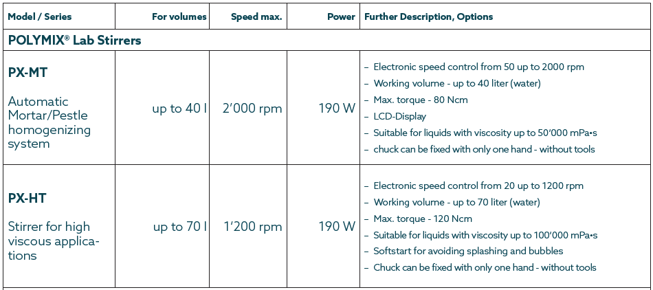 POLYMIX® PX-MT и POLYMIX® PX-HT – это лабораторные верхнеприводные мешалки для эффективного перемешивания и гомогенизации жидкостей разной вязкости, а пропеллерные (лопастные) мешалки являются одним из основных типов рабочих органов для этих установок.