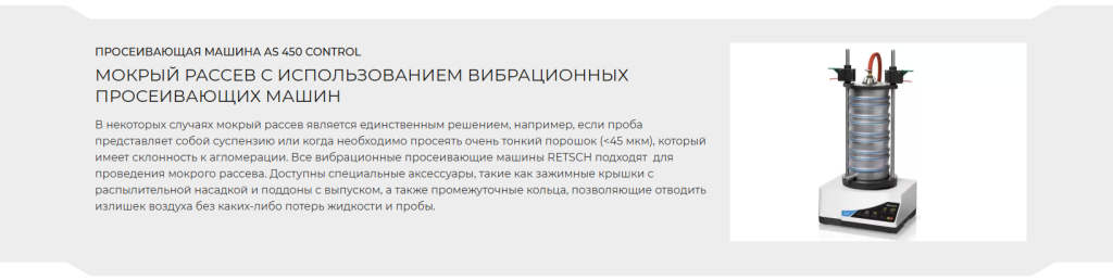 С помощью вибрационного просеивающего шейкера AS 450 control компания RETSCH разработала свой первый 3-D-шейкер для сит 400 мм и 450 мм. Его можно использовать для сухого и мокрого просеивания образцов весом до 25 кг. AS 450 control сочетает в себе преимущества электромагнитного просеивания — контролируемую амплитуду с высочайшей воспроизводимостью — с мощным приводом на основе технологии CET (непрерывная передача энергии).